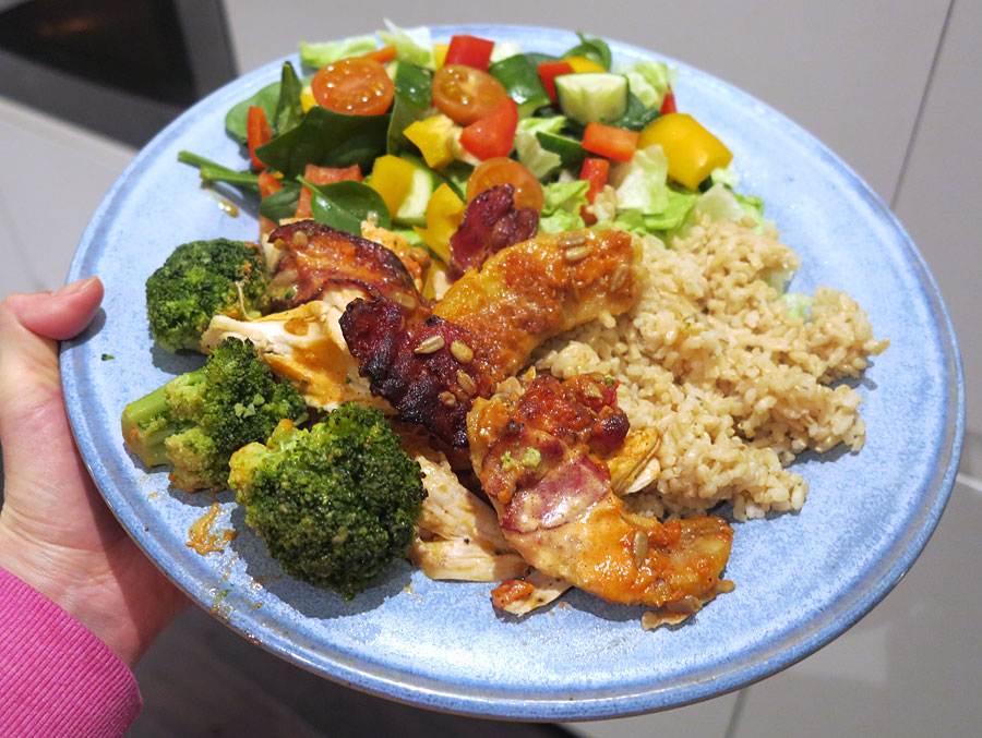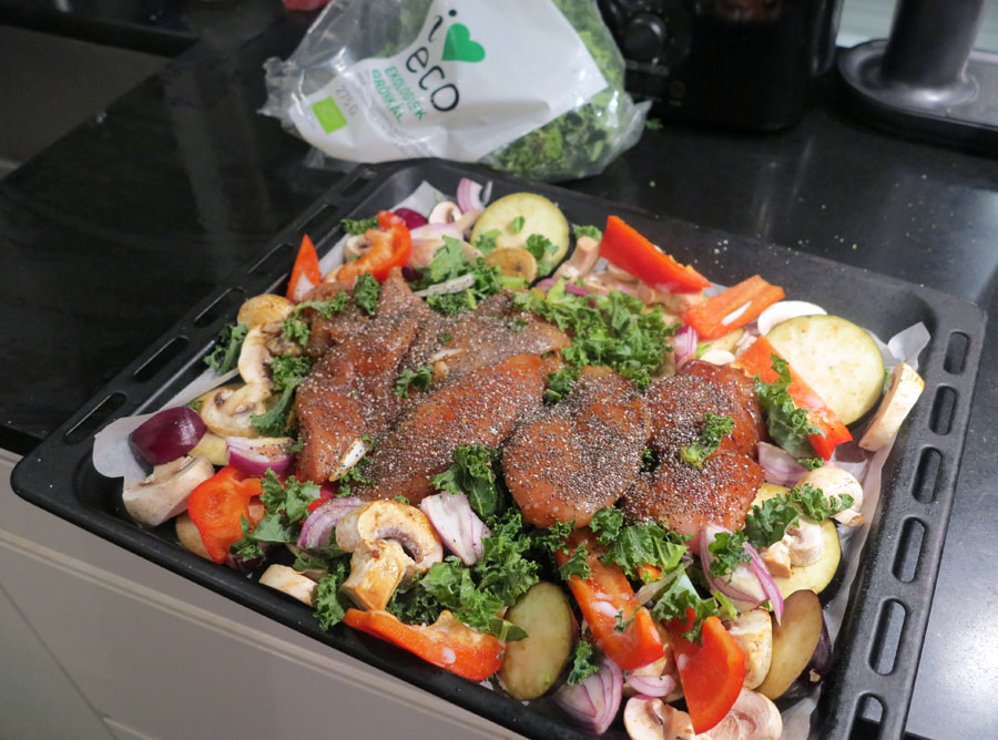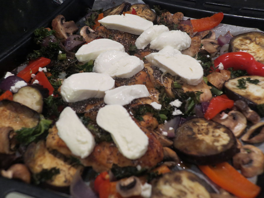 Lägga kycklingen på en bädd av grönkål och andra grönsaker blandade med flingsalt och kokosolja. Panera kycklingen med chiafrön, och mot slutet av tillagningen låta mozarella smälta över alltsammans. Serveras med fördel ihop med fetaost- och spenatpaj.