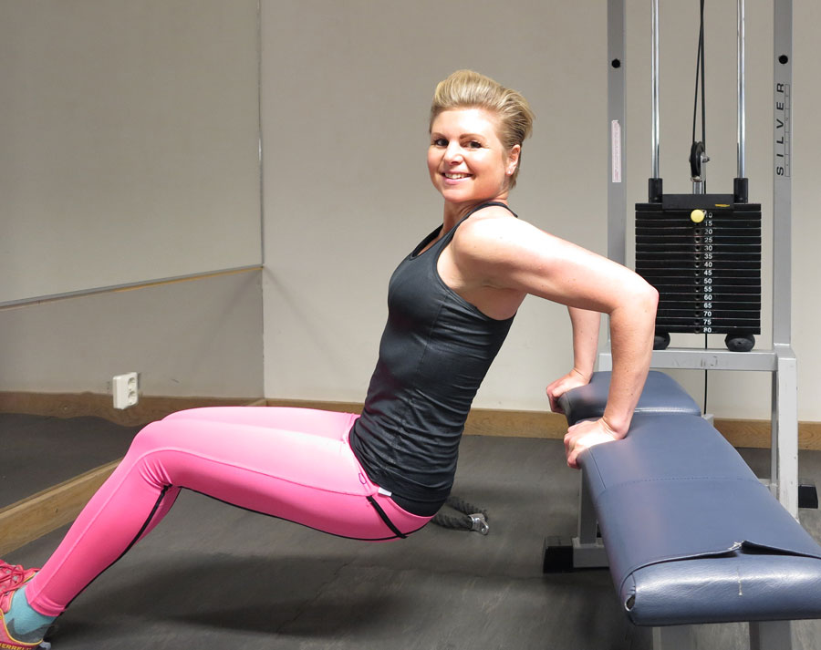 Trots en tids frånvaro från dippandet kände jag mig stark och utökade min egen kroppsvikt med en extern. I brist på bälte knep jag åt en vikt mellan knäna och gjorde så många jag orkade för att sen droppa vikten och fortsätta några till, d.v.s. ett dropset när du byter till lättare vikt och fortsätter några repetitioner till i samma övning. Du kan också knipa åt en hantel mellan benen istället. Båda varianterna ger även lite extra träning till ”knipet” och insida lår.