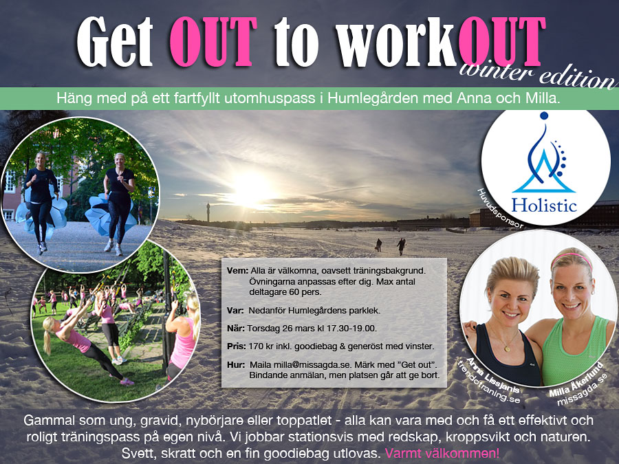 Det ligger fortfarande en och annan snöfläck kvar i Stockholm men det hindrar oss inte från rolig utomhusträning. Många har efterfrågat ett nytt Get OUT to workOUT och nu kryper jag och Milla ut från våra vinteride, fulla av energi att dela ut. Torsdag 26 mars kl 17.30-19.00 bjuder vi för fjärde gången in till träningsfest i Humlegården tillsammans med vår huvudsponsor Holistic, ett företag som precis som mig och Milla står för ett helhetstänk med hälsa inifrån och ut. Träningsupplägget liknar första, andra och tredje gången, med vissa modifieringar av övningar och redskap. Peppen är dock densamma.