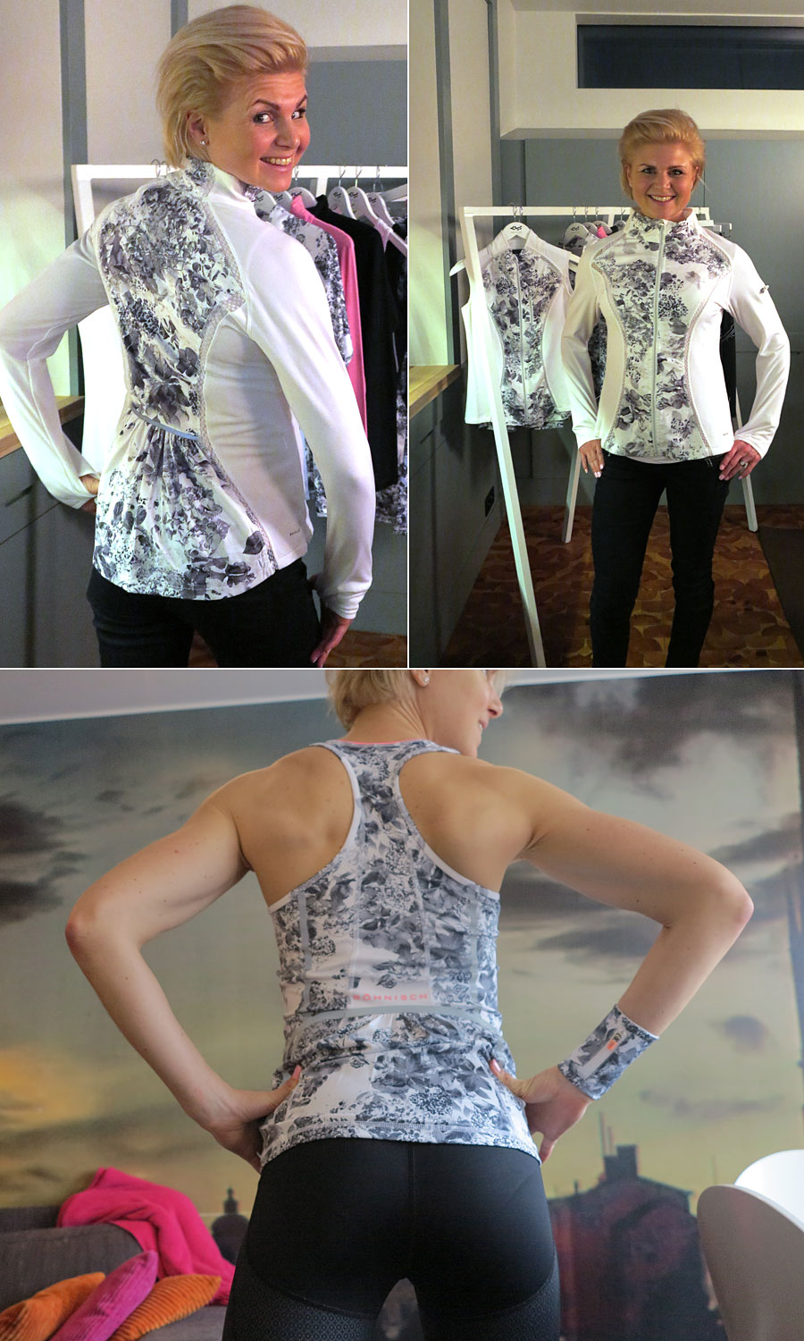 Kläderna jag nu hunnit testa är fantastiskt fina och unikt skapade med tanke på tränande kvinnors kroppar och krav. Feminina blommor i svart, vilket gör att det inte blir ”för gulligt”, tillsammans med den rosa nyansen flamingo, skärningar som framhäver de kvinnliga formerna, praktiskt funktionsmaterial och smarta detaljer. Västen och jackan är i prasselfritt funktionstyg med lite tjockare material på jackärmar och över bröstet, luftig spets i sömmarna och tumhål i ärmslutet för mellankalla väderförhållanden.