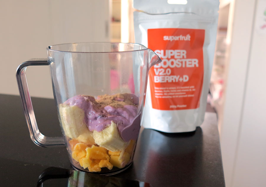 I goodiebagen från Blogger Boot Camp fanns en påse med ”Super booster v.2.0 berry + D” från Superfruit – ett naturligt smak- och näringsrikt pulver utan tillsatt socker. Jag brukar tycka gröna superpulver tränger igenom med sin ”jordsmak” (i min mun), men den här pulvermixen är riktigt god. Igår gjorde jag en glassig smoothie med frusen mango, banan, blåbärskvarg och superpulvret.
