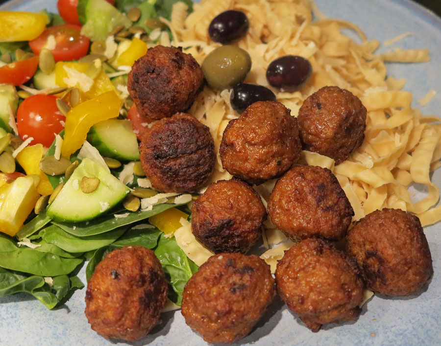här blev det nästan samma middag som ni hade till lunch, förutom att jag rullade egna köttbullar och kokade fullkornspasta. Mycket godare med egna köttbullar som smakar kött (brukar inte ha i ströbröd eller liknande, utan bara ägg, kryddor, vitlök och lite röd currypasta). Åh, tonfiskbiffarna ska jag verkligen testa att göra någon dag- Har varit sugen på tonfisk några dagar! 😀