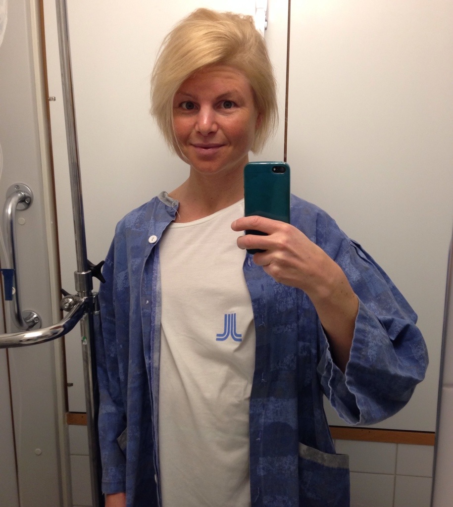 Med en sista selfie innan operationen, iförd klassisk Landstingsuniform, vill jag bara hälsa att allt har gått bra. Jag överlevde. Inga komplikationer, och nu är både diastasen och ett mindre bråck lagat. Jag vaknade upp med sjuk smärta i magen efteråt, men med lite morfin och annat känns det ok. Stramt och ömt om magen som jag fått en korsett runt, men ok.