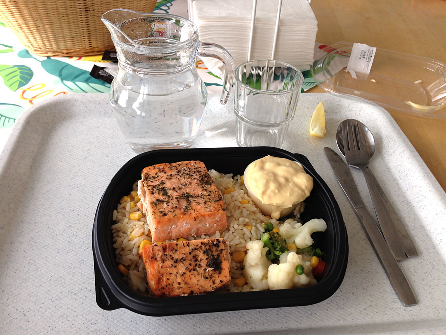 Maten är sådär. Jag har inte blivit serverad en enda färsk grönsak eller frukt på hela tiden jag varit här, men hade turen att få besök av mannen och mamma mitt i lunchtid, så Jonas gick och köpte en bit lax med ris och sås till mig. Det smakade bra, och min aptit är det inget fel på.