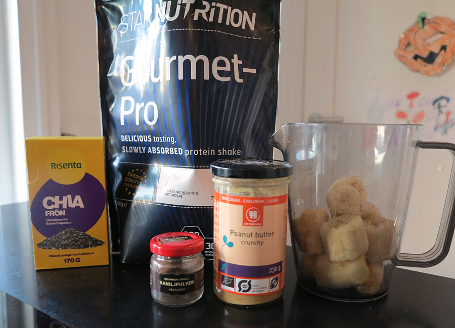 - 1 skopa Gourmet-Pro Double Chocolate (alt. ersätt med annat proteinpulver med chokladsmak eller 1 burk Lindahlskvarg med choklad/hasselnötsmak)