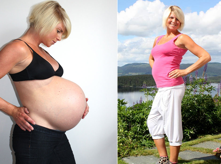 Efter de två första graviditeterna läkte magmusklerna som de skulle och fick tillbaka sin normala funktion och utseende. Men magen klarar inte hur mycket som helst, och efter tvillinggraviditeten hittade de yttre magmusklerna inte tillbaka. Ovan bilder från 2011 – före och ca 1 månad efter kejsarsnittet.