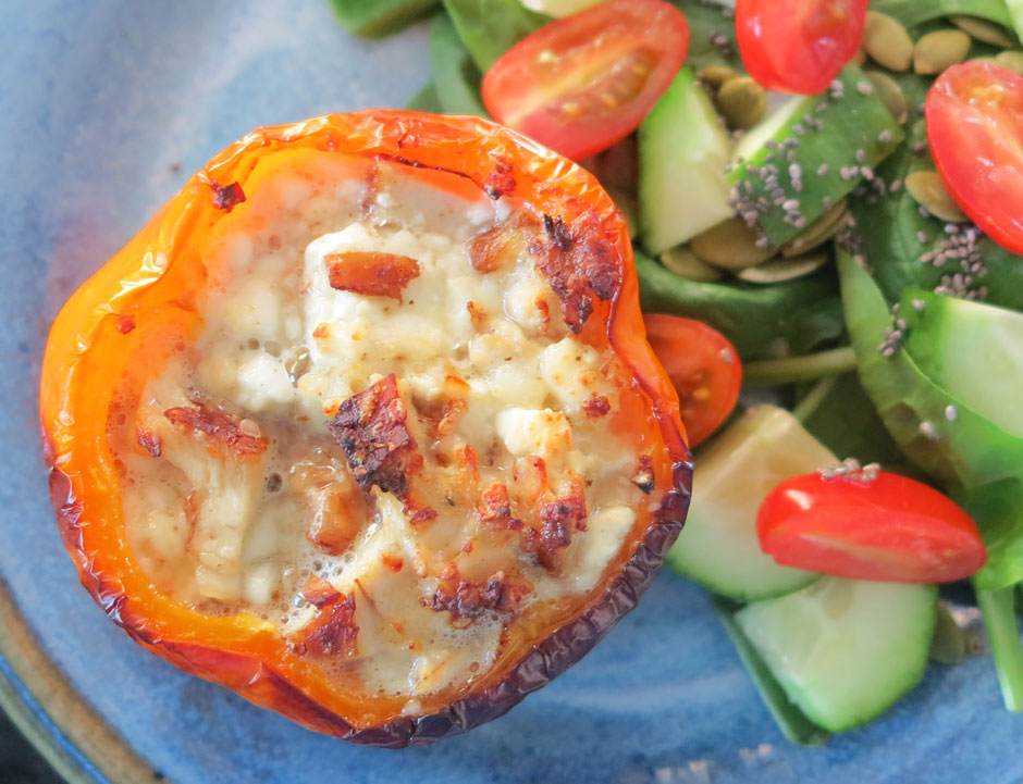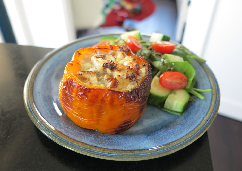Paprika. Den här är tillagad i ugn men går lika bra att grilla. Överbliven kycklingfilé tärnade jag och blandade med keso, fetaost och kryddor. Jag smorde paprikan med olivolja, fyllde den och tillagade i ugn på 225° i ca 30 min. På grillen skulle jag rekommendera folie så att inte fyllningen rinner ut.
