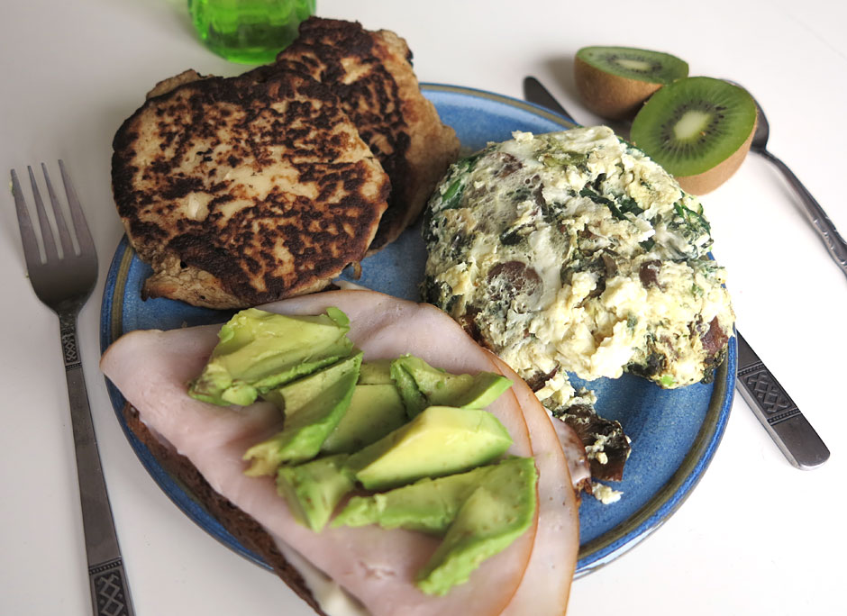 Potatisplättar av överbliven mos, en micrad skål spenat + ägg och champinjoner till en sorts omelett, en helt vanlig macka med philadelphiaost, kalkon och avocado, samt en kiwi till efterrätt.