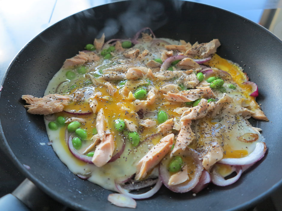 Allt-i-pannan-mat. Här är det bara att gå loss med allt som finns i kylen. Jag gillar stekt lök i kokosolja, ägg som binder ihop och knapriga små chiafrön som topping. I denna även lyxig röding och sojabönor.