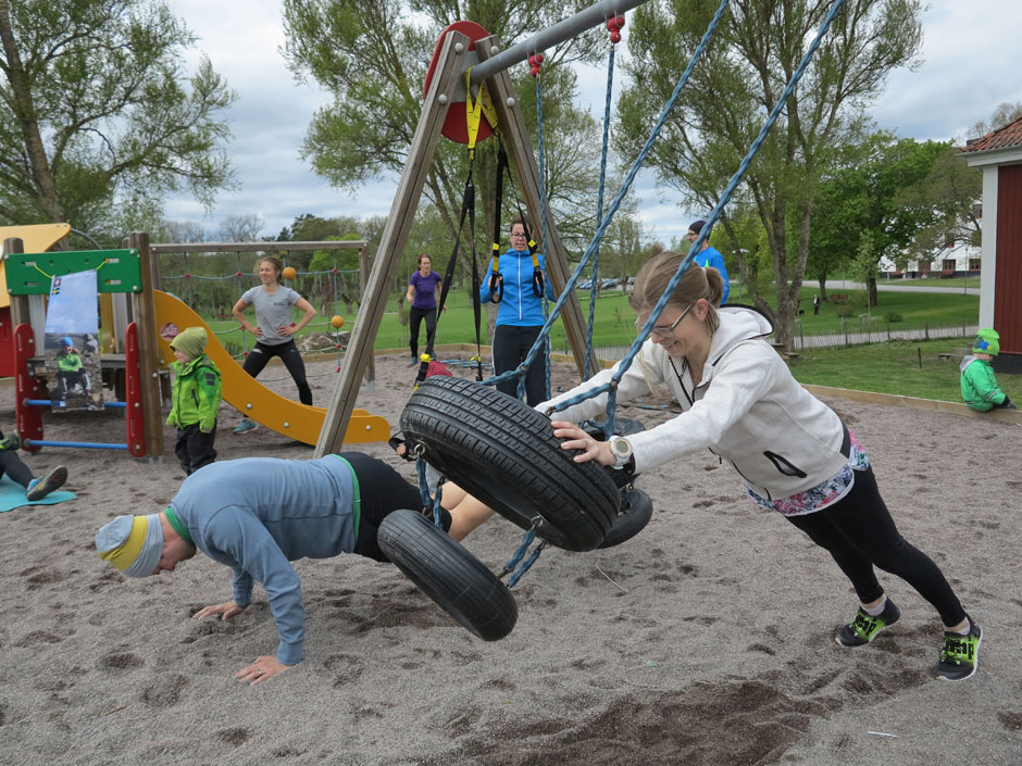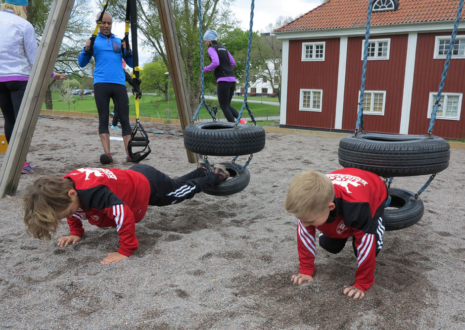 Dels kan mindre barn avlägsna sig och leka vidare i parken intill om de inte orkar vara med hela tiden, men många av övningarna liknar barnens naturliga rörelser och lek. Dessutom tycker de det är roligt att göra saker tillsammans med sina föräldrar, övningar som i cirkelformat går att göra riktigt utmanande om man är kreativ. Att gå från station till station, t.ex. med 45 sek arbete – 15 sek vila, gör dessutom att barnen inte hinner tröttna.