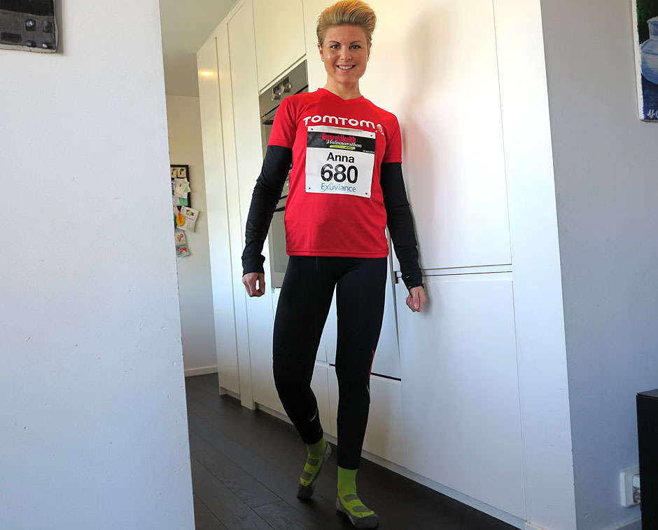 4. Kläder. På loppets hemsida brukar de ge råd vid tävlingsdagen. Annars – använd skor du är van att springa i (aldrig helt nya), sätt ev. på förebyggande skavsårsplåster där du vet att du brukar få skav (t.ex. hälarna) och kör lager-på-lager-principen med kläder. Bättre att kunna kasta av sig ett plagg om det blir för varmt än att frysa, men tänk på att du garanterat kommer bli varm när du satt igång att springa så hellre lite sval än för varm vid start. När det gäller material är tunna vindplagg och kompressionsplagg i funktionsmaterial bra i tajts och långa strumpor. Sköna, håller blodtrycket uppe, stabiliserar och ökar cirkulationen.