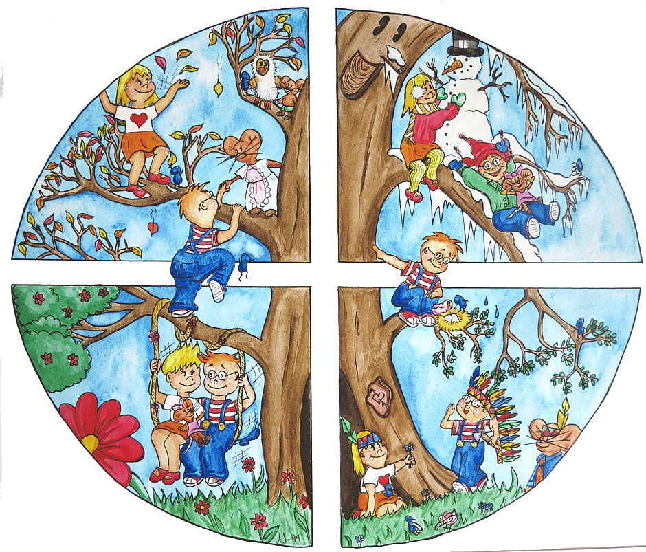 Igår träffades vi på Elite Rehab Studio´s kontor för att planera vidare, samt prata ikapp vad som händer i våra liv över varsin räksallad på Café Foam. Det är alltid lika roligt att träffa den här sprudlande, smarta tjejen som jag har mycket att lära av. Caroline är superproffsig och kompletterar min konstnärssjäl bra i det här projektet. Inga detaljerade bilder av det idag, det kommer, men nedan ser du ett exempel från en bild av barn som leker i sitt klätterträd i olika årstider som jag gjort till en annan barnbok.