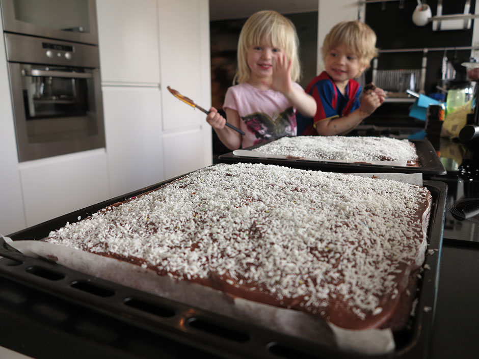 Igår bakade jag och mina glada medhjälpare två plåtar kärleksmums till föräldrarfikat vid skolavslutningen på onsdag och var tvungna att provsmaka misslyckade bitar. För att se om kakan dög. Som en kul grej jämförde jag det traditionella ”sockerreceptet” med Fannys sötad med morotspurré, kokossocker och Stevia. Originalkakan var snäppet saftigare eftersom den var nybakad, men annars tyckte jag den sockerfria var godast. Dessutom är fördelen med sockerfritt kvällsfika nära inpå läggdax, precis som koffeinfritt kaffe, att jag har lättare att somna.