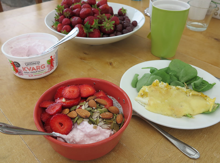 Till det brukar jag även äta en chiapudding med en klick av nya Lindahls Kvargen Rabarber/Jordgubb, samt äkta vara från trakten. Missa inte denna limited edition kvarg – godast av alla smaksatta kvargsorter jag smakat, och missa inte att frossa i Svenska bär under sommaren. Galet god kombination med diverse frön och nötter som topping.