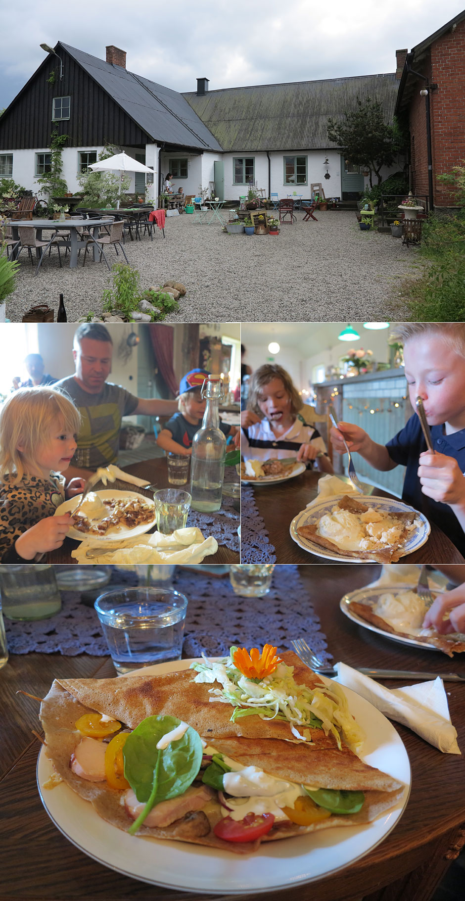 Lunchen äter vi ibland hemma och ibland på våra road trips. Det finns så många mysiga små ställen, mycket närproducerat, och i förrgår åt vi på Franskans Creperie i Rörum bara en mil från där vi bor (inläggets översta bild är också därifrån). Tvillingarna tog det säkra kortet med pannkakor med glass. Hampus valde en crêpe med mörk choklad, vaniljglass och grädde. Hugo en crêpe med Skånsk spettekaka, vaniljglass och vit choklad. Jag och Jonas åt mer matiga galetter med rökt kyckling, bladspenat, ost och ädelostcreme. Alla mycket nöjda. Och mätta.