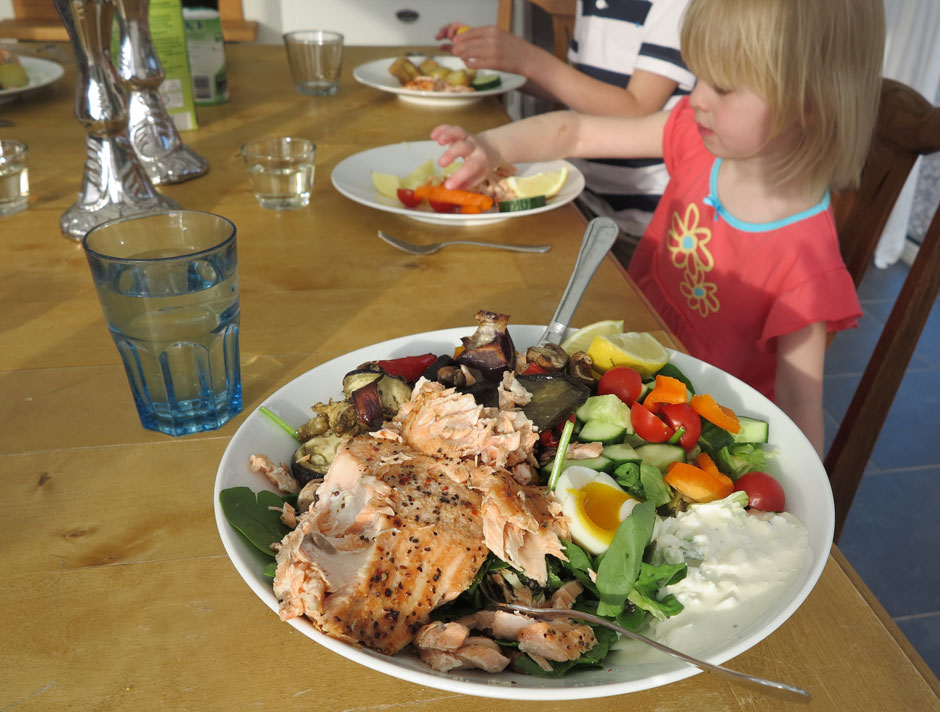 Middagarna blir sena med grillat för det mesta, men vädret har varit minst sagt instabilt så den här dagen fick det bli ugnsmat istället. En fet bit lax från Buhres Fisk i Kivik tillsammans med min crème fraîche/vitlök/fetaostsås och ugnsgrönsaker går dock inte heller av för hackor.