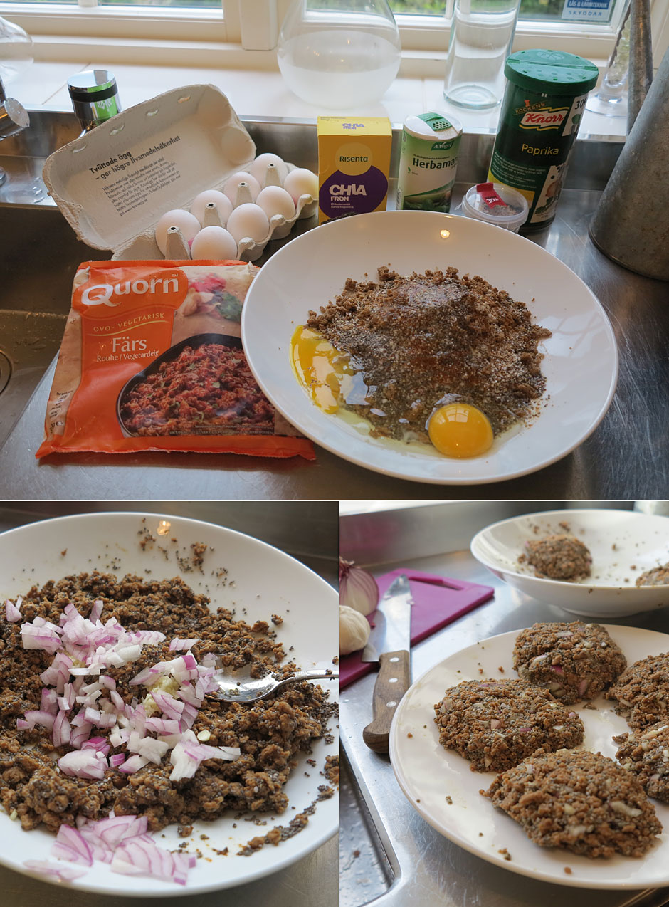 - Blanda upptinad quornfärs med ägg, chiafrön och kryddor. Låt sen stå och svälla ca 10 minuter.