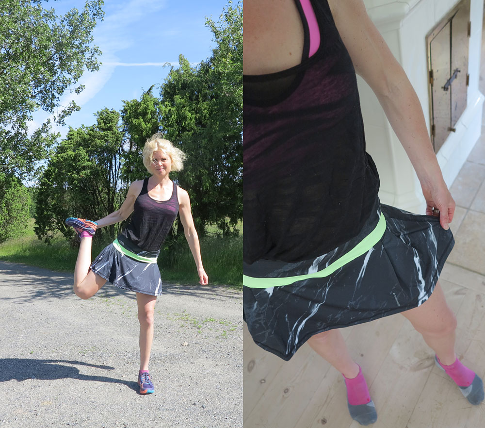 Dagens somriga träningskläder: Linne och löpkjol (påsydd över korta hotpants) – Björn Borg, sport-bh – Casall, strumpor – Gococo, skor – Merrell.