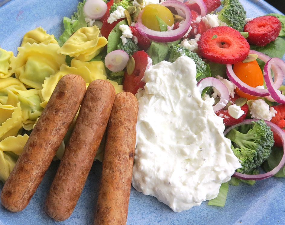 Med elgrill på balkongen hindrar inte lite regn oss från att fixa en somrig snabblunch. Som variation och veckodagen till ära quornkorvar för en Meat Free Monday-lunch, till vilka jag kokade tortellini riccotta/spenat. Mycket godare än bröd till tycker jag, om man inte gör eget (t.ex. pannbröd). Till detta en fräsch sallad med bl.a. babyspenat, färsk broccoli, rödlök, jordgubbar och fetaost. Tillsammans en smaksensation. Min specialare, en fetaostkräm vi äter till nästan allt, visade sig också passa utmärkt ihop med quornkorven.