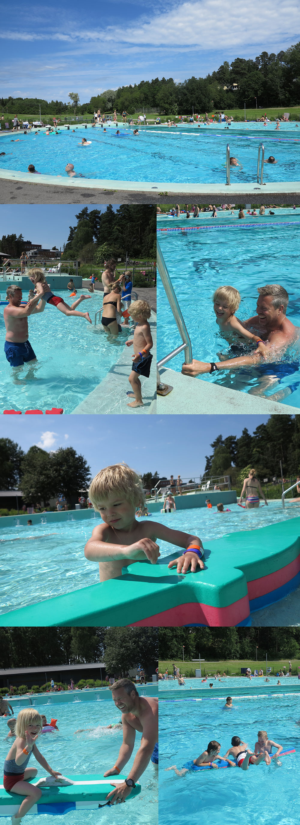 Oss också. Av ren bekvämlighet har vi bara brukat gå till badet nedanför huset på Gärdet, men igår vidgade vi vyerna till Norskogsbadet i Täby. Där finns 3 tempererade bassänger med olika djupt vatten som passar för alla åldrar och vattenvana, roliga flytleksaker som våra barn gillade extra mycket och en 25-metersbana för motionssim. Badet är omgett av stora gröna fält – perfekt för picknick och fotbollsspel, det finns ett bra utomhusgym, en tennisplan och lekplats intill. Som upplagt för en heldag med lek och träning.