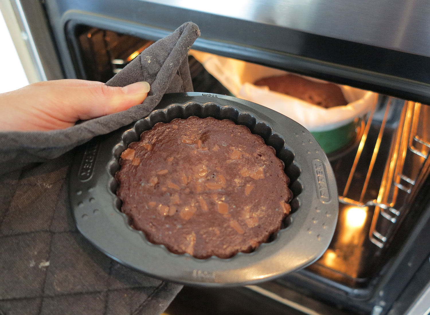 - Häll smeten i formen och grädda kakan i mitten av ugnen i ca 10 minuter (eller kortare om du vill ha den ännu kladdigare. Ett tips är då att ställa kakan i frysen en stund för att stelna men ändå bevara kladdigheten).