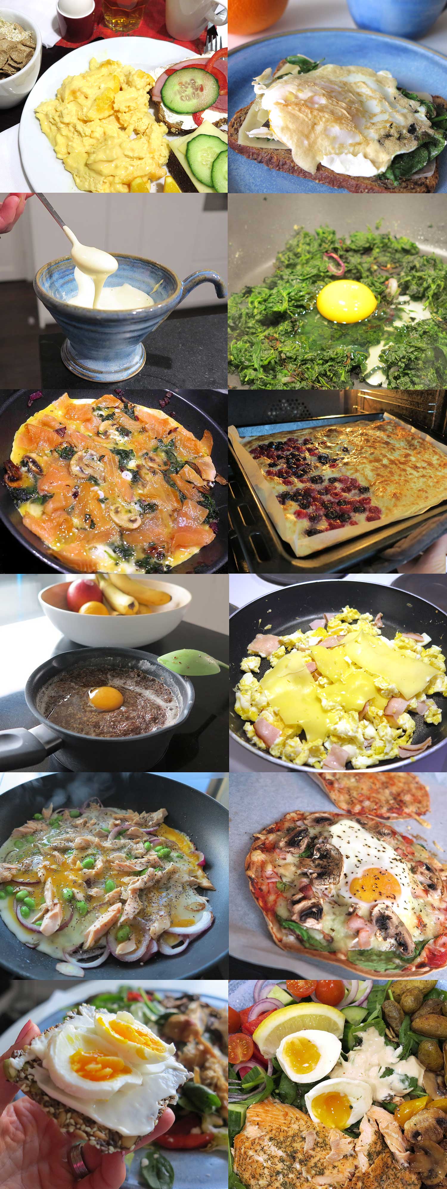 ..i omeletter, gröt, på mackan, i pasta, som äggtoddy, i fiskpudding, vid brödbak, på pizza, i spenat, till pannkaka (t.ex. bananpannkaka) och mycket annat, men många gånger bara som de är.