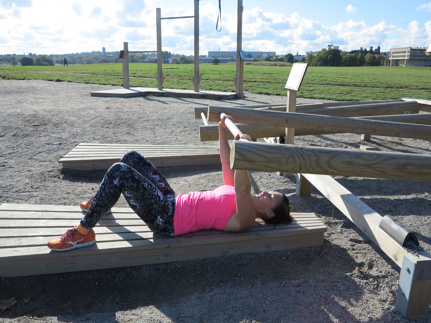 Annikas vill gärna få in både kondition och styrka i sina pass, vill träna hårt och det fick hon med mitt upplägg. Efter uppvärmningsjogg och 6 pulstoppar i en närliggande backe tränade hon igenom hela kroppen med 50 repetitioner per övning. Räkna är ett bra sätt att hänga upp tanken, behålla fokus, och med så många repetitioner på kort tid (vila gjorde Annika vid behov/när jag såg att hon tappade tekniken) hålls tempo och puls uppe.