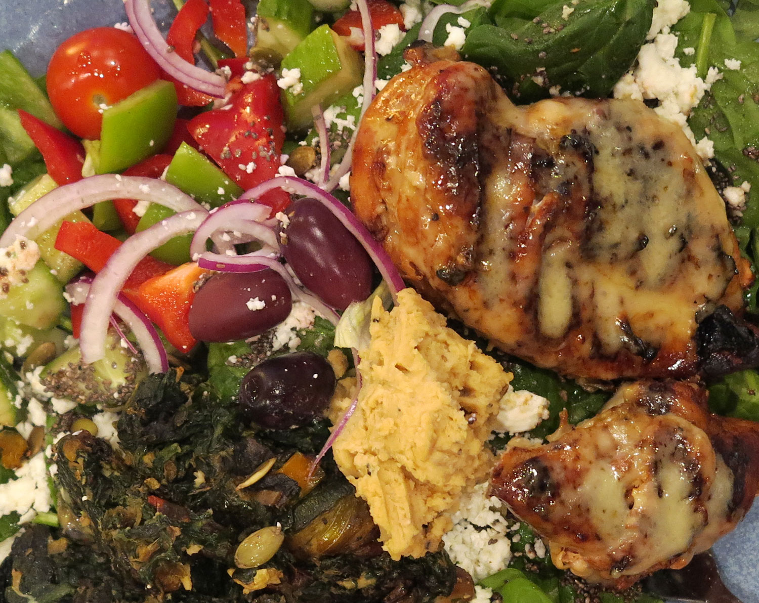Kyckling med smält mozarella, fetaost, avocado, oliver, vitlöksfräst spenat och andra grejer är också gott till hummus, men det mesta funkar.