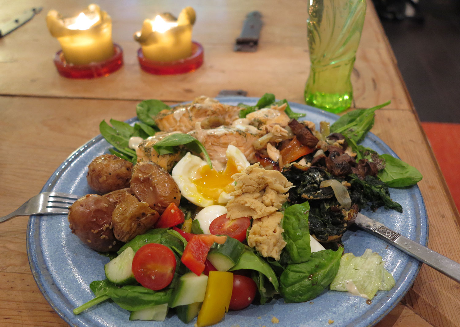Lax som grillats ihop med grönsaker och potatis i ugnen, färska grönsaker, sås och som grädde på moset – hummus!