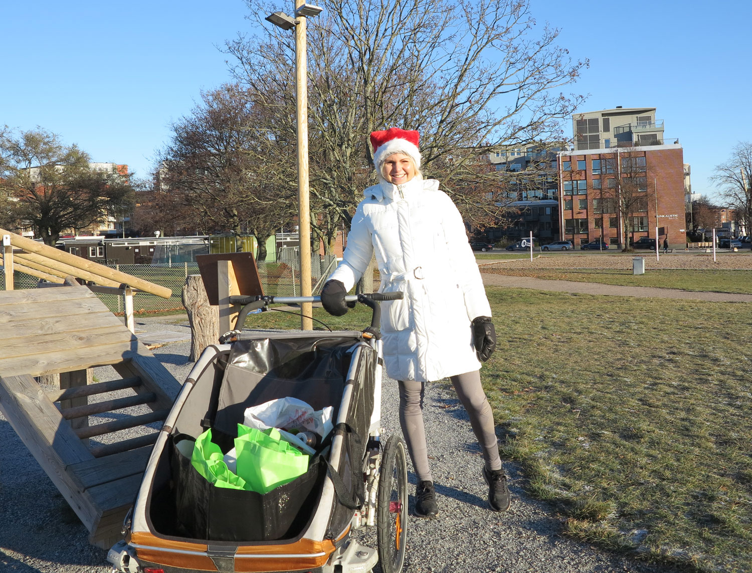 Tomten med julklappspåsar fulla av träningsplagg, mössor och annat smått och gott, glögg och pepparkakor.