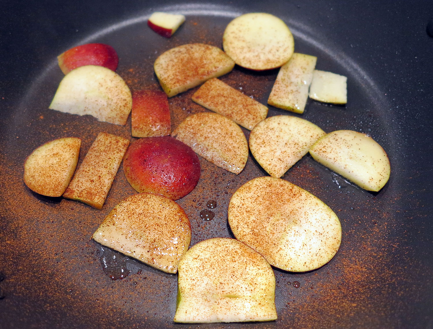 1. Stek äppelskivor mjuka i en panna med kokosolja och kanel.