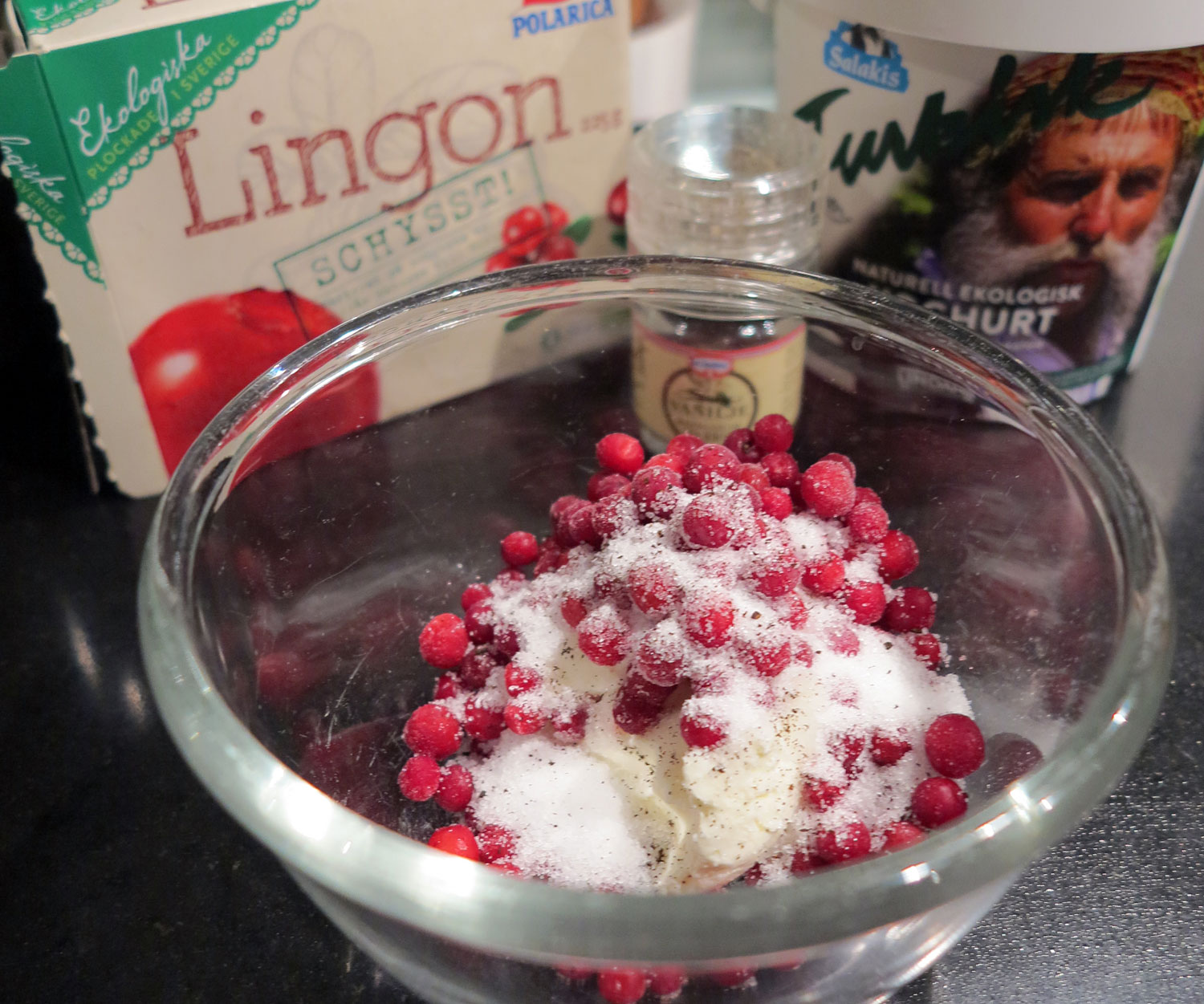 2. Mixa frysta lingon med socker och vaniljpulver. Rör därefter i yoghurten.