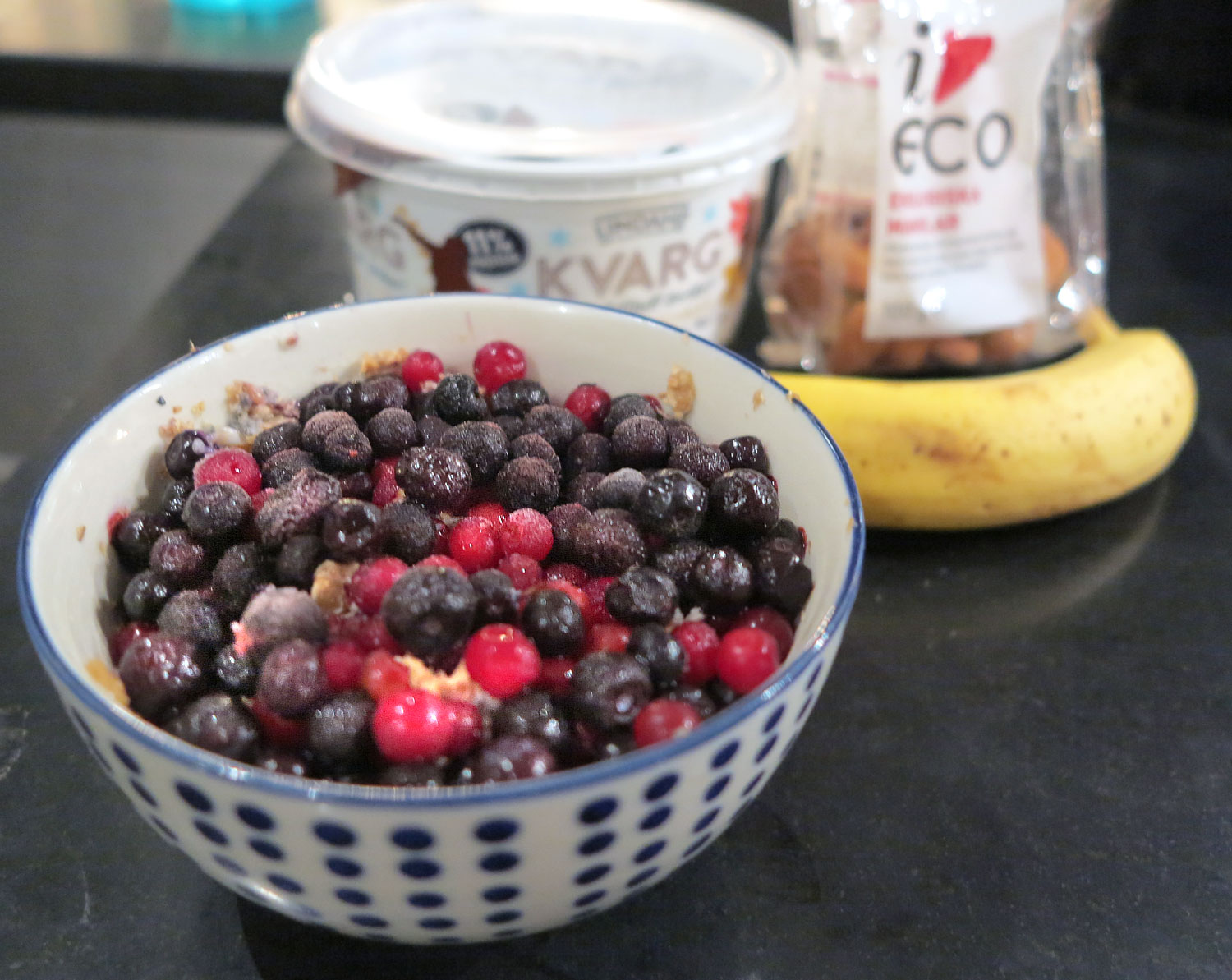 8.15: Efter träning – frukost. En chiapudding med lingon och blåbär som stått över natten. Till den en klick kvarg, en banan, mandel eller annan topping.
