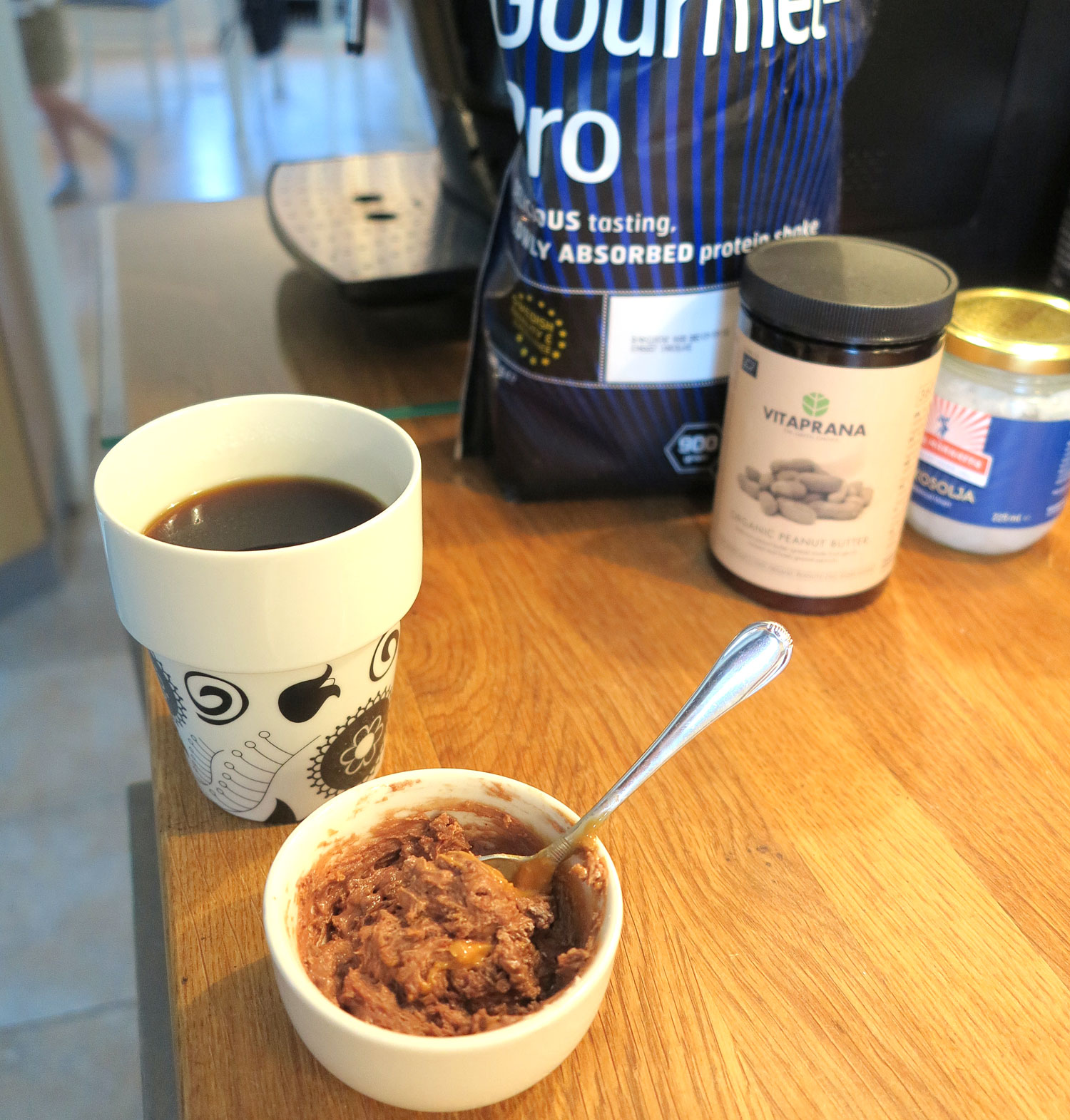 06.30: Före tidig morgonträning. Ofta inte hungrig men vill spara muskelmassa vilket fett + protein hjälper mig med. Här en riktig godisvariant, men ägg/kesella/keso är andra motsvarigheter. Annas proteinkräm: