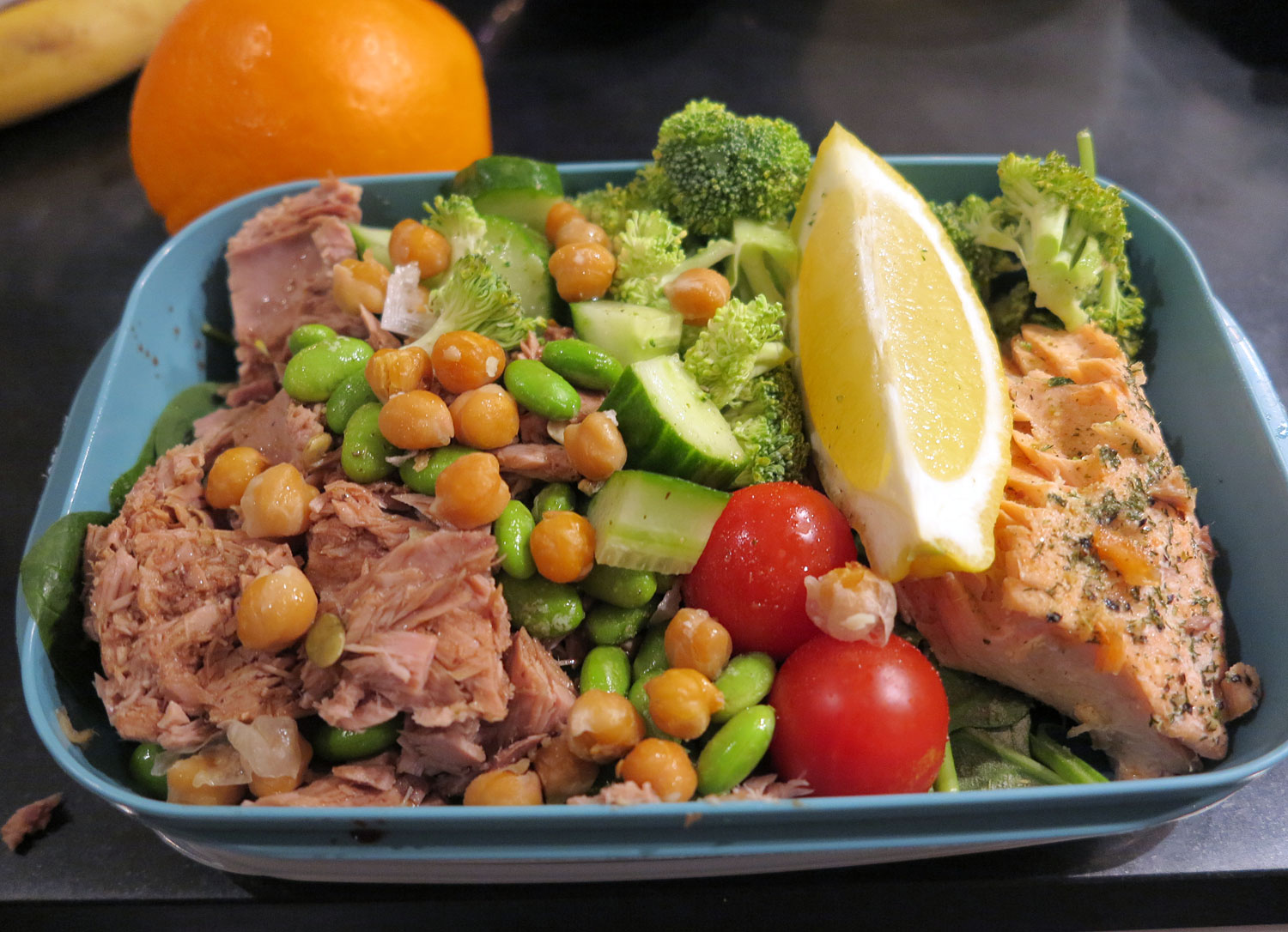 12.00: Lunch på skolan. En sallad på bladspenat, broccoli, 1 burk tonfisk, rester av lax, rostade kikärtor, sojabönor, vinegrette + en apelsin om jag inte blivit mätt.