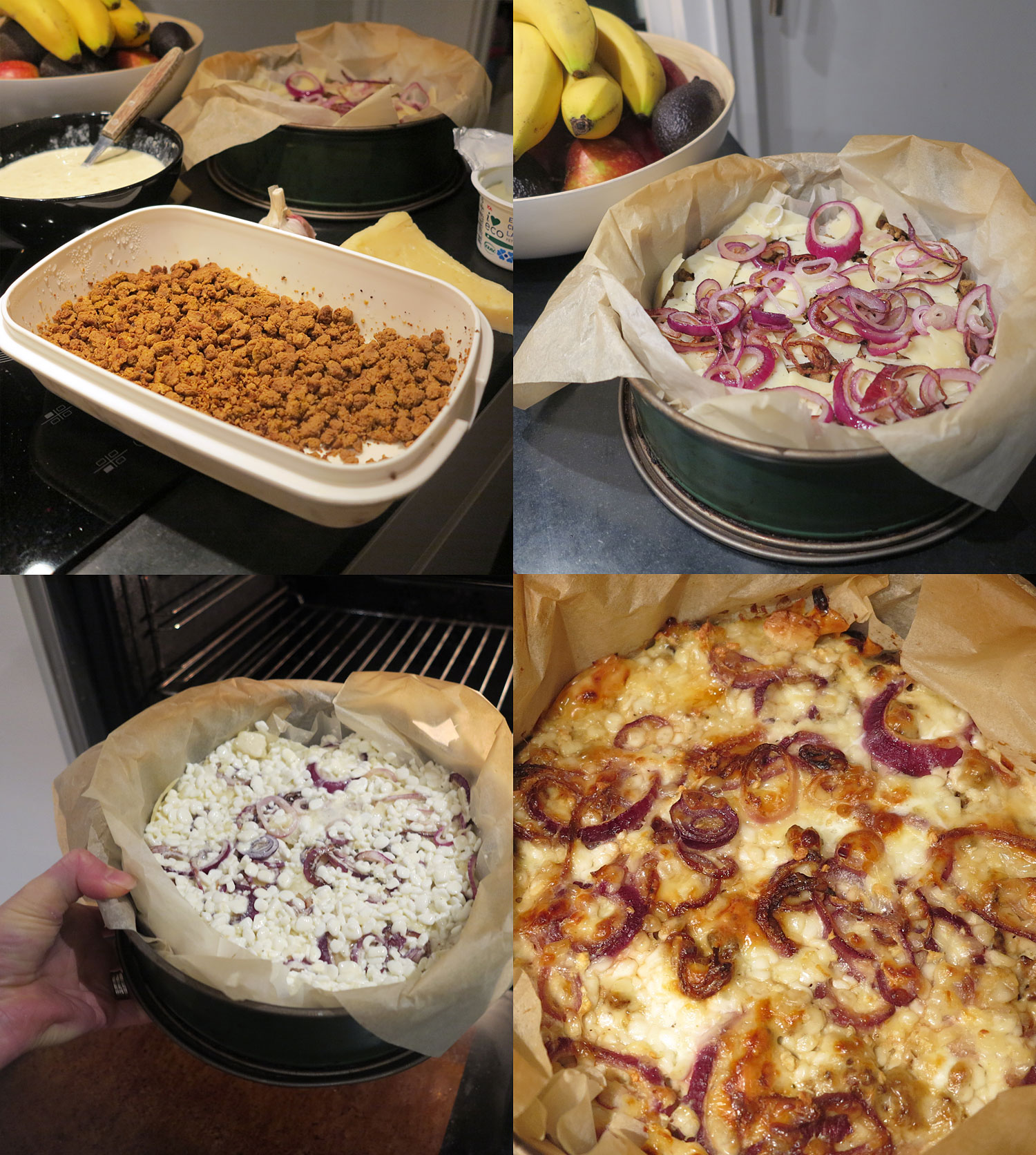 - Fördela Quornfräset över pajbotten, lägg på rödlök och sist ägg/ost-blandningen.