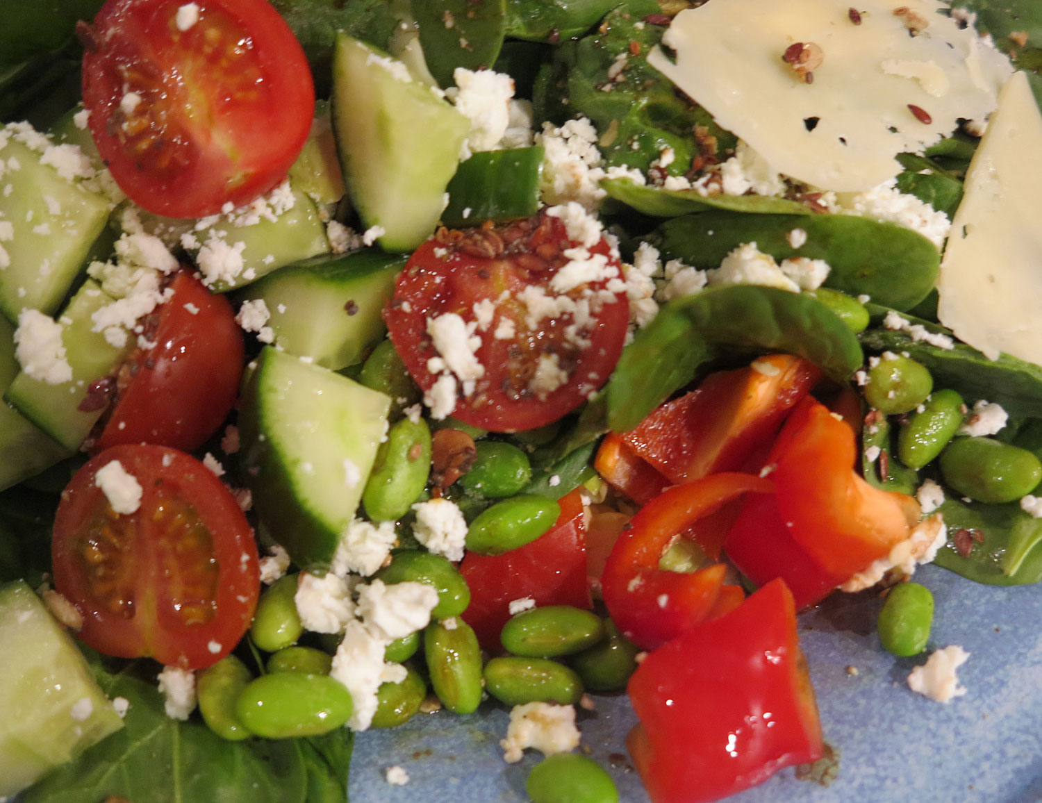 Kalla Quornbitar (tidigare marinerade och stekta i paprikapulver, vitlök, oregano, s&p) Ekblad-sallad, ruccola, avocado, soltorkad tomat, majs, feferoni, gojibär, edamamebönor, cashewnötter, persilja, någon god ost och självklart dressing med balsamvinäger/ vitvinsvinäger och olivolja! 🙂