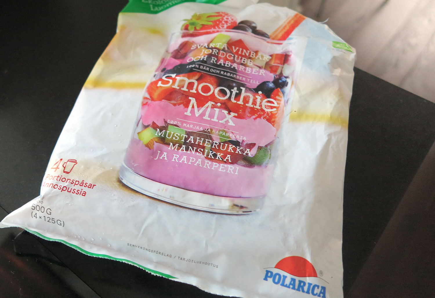 Jag använde Polaricas KRAV-märkta nyheter med smidiga portionspåsar av frysta bär som jag fått hem att testa. Idag ”svarta vinbär, jordgubbar och rabarber” men de finns även i smakerna ”blåbär och lingon” och ”Hallon och svarta vinbär”.