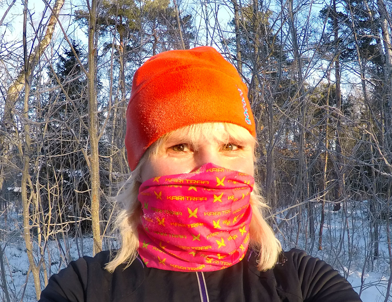 Vid löpningen – en fleece-mössa från Gococo och runt halsen en duff från Kari Traa. Sistnämnda behövdes inte idag då det var lite varmare, men annars bra att andas genom när det är riktigt kallt. Att andas genom näsan är också en metod jag använder mig av vid träning i kyla.