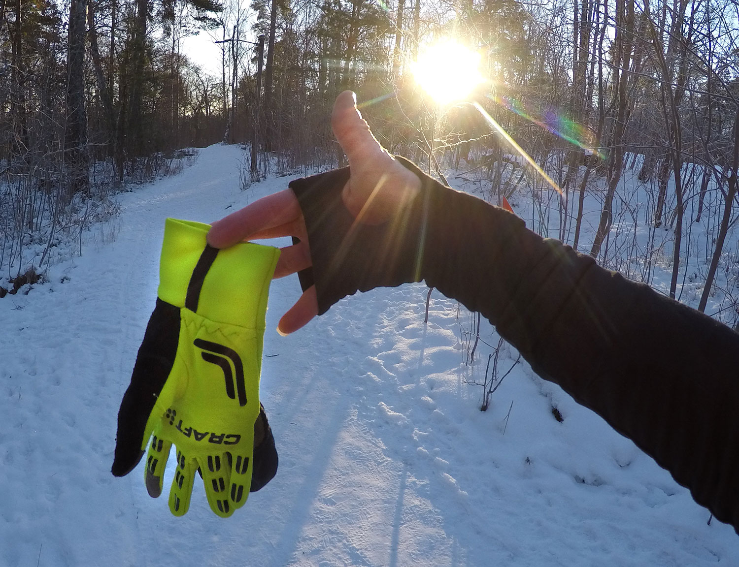 Vid löpningen: Craft weather hybrid glove – vind och vattenskyddande handskar med extra vindskydd att dra över fingrarna. Dessutom hade jag varma handledsskydd med tumhål från IceBreaker under.