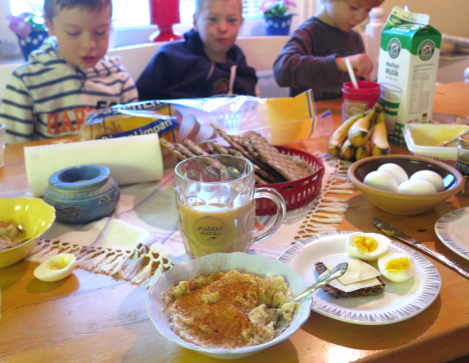 Vardag: Barnen äter frukost allt eftersom de vaknar/väcks, jag tar min kaffe- och mellanmålskvart när allt är under kontroll med alla som ska iväg. Samma sak vid middagen. Många gånger ska storbarnen iväg på fotbollsträning och får äta först medan jag och Jonas ofta sammanstrålar på kvällen när tvillingarna är i säng. När allt lugnat ner sig, vi kan prata och äta i lugn och ro i sällskap av Hugo och Hampus med varsin kvällsmacka.