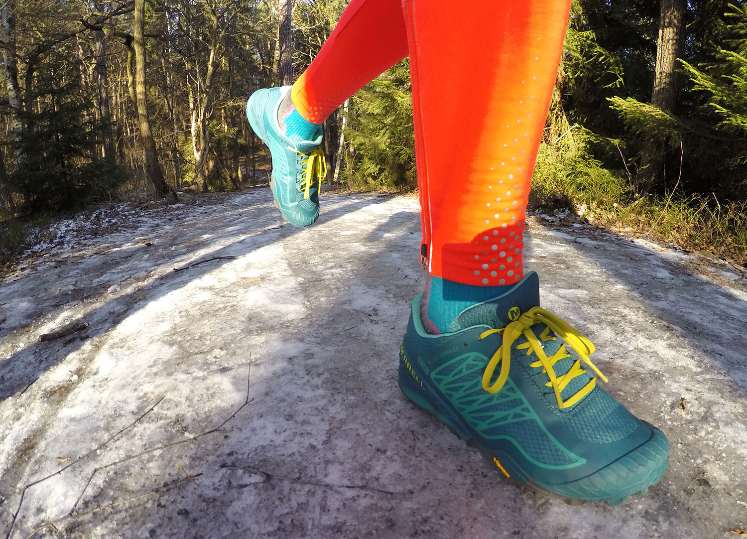 Jag valde varmfodrade tights, underställströja, vantar och långa kompressionsstrumpor i ull eftersom det fortfarande är svalt ute och du kan bli nedkyld av all svett. På fötterna Merrell All Out Ice Waterproof med ståldubbar – annars vore löpning i Lill-Jansskogen läskigt.