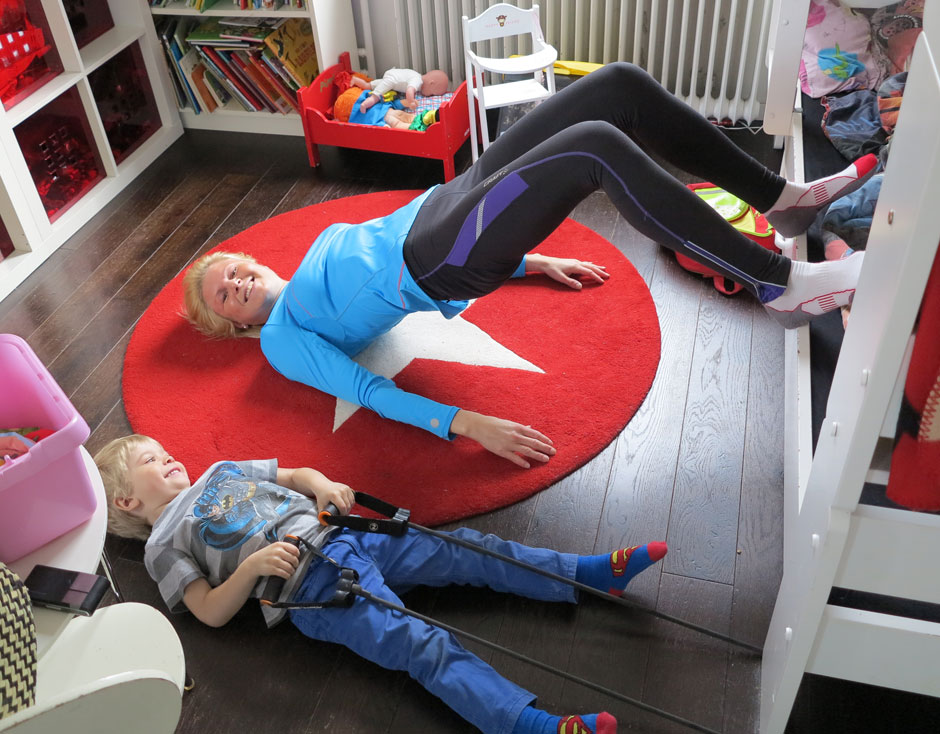 Successivt utökade jag mina promenader och sjukgymnastiken med hemmaträning. Precis som efter mina graviditeter började jag träningen liggande med gummiband och egen kroppsvikt där jag lättare kunde avlasta de raka magmusklerna. Exempel på ett av de första  träningspassen jag körde hemma hittar du här.