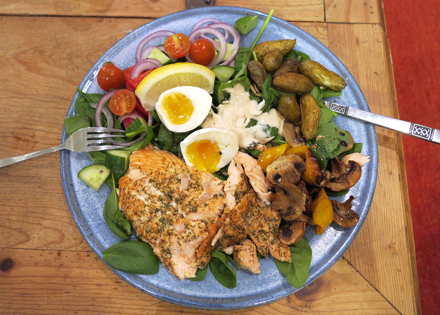 Lax med ägg och grönsaker.Tisdag – lax: På en plåt med småpotatis, grönsaker, ägg och ponzu mayosås eller vitlökssås – något vi äter minst en gång i veckan. Lax är så tacksamt. Saftigt, lätt att laga stor mängd av och alla i familjen tycker om det. Speciellt Junior och jag har det som älsklingsrätt.