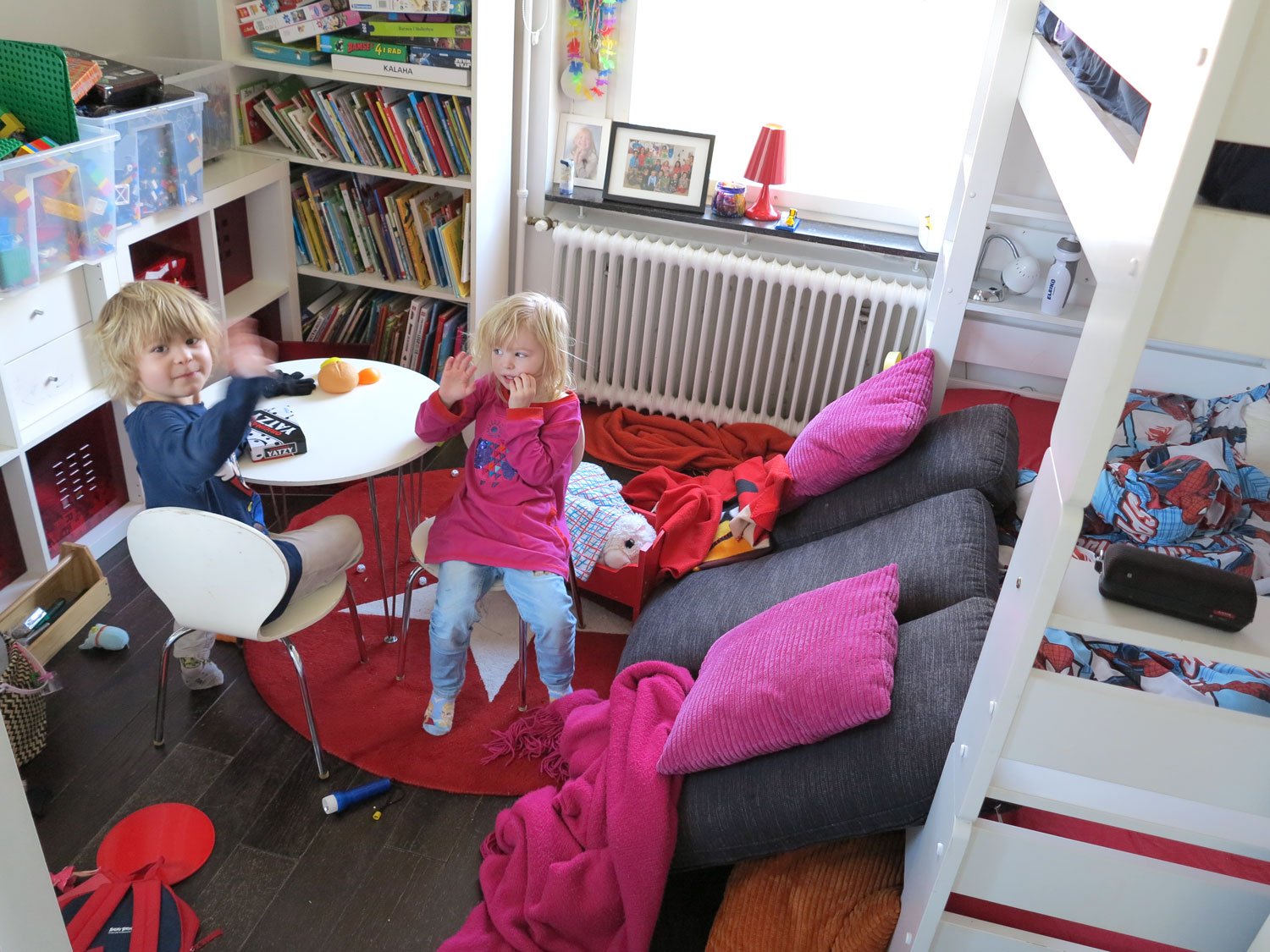 Men. Efter en alvedon är Jonna som vanligt och till slut klättrar allihop på väggarna, inklusive mig. Sitta framför TV/dator/iPad funkar en stund, men inte en hel dag. Då är kojbygge, dans till Piratsessan, baka, rita, göra pärlplattor eller bygga lego poppis hos oss. Nästan lika höga torn som mamma!