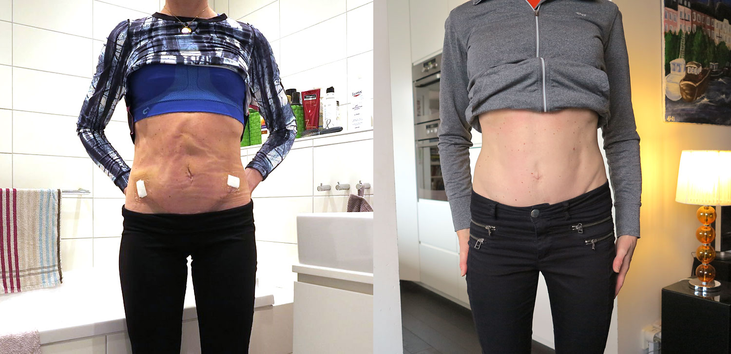 2 veckor efter diastasoperation + 1 år efter diastasoperation /Anna LissjanisVänster: två veckor efter rectus diastasoperationen. Höger:  1 år efter operationen.