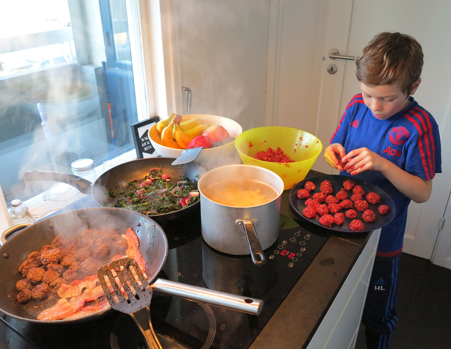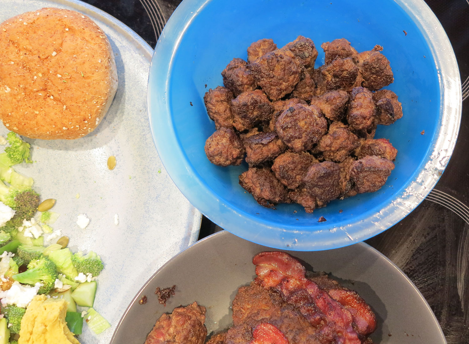 Även på matfronten har jag fått nytändning. Efter att ha blivit bortskämda av min mästerkock till mamma känns det roligt att laga mina egna maträtter igen. Och gott att äta dem. Vi fick med några kg köttfärs från föräldrarnas gård och redan i går gjorde jag och Hampus storkok. Jag är lat och gör hellre hamburgare, men han tycker det är kul att rulla små köttbullar. Det blev lite av varje, plus grillad kycklingfilé på balkongen, ugnsrostade grönsaker, vitlöksfräst bladspenat och hummus.