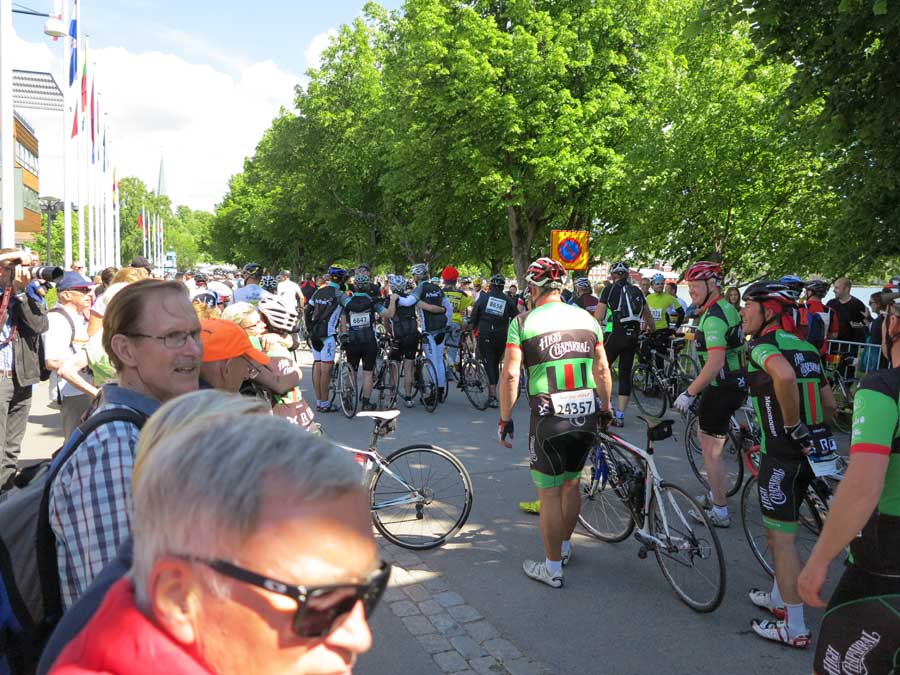 Målområdet där fotograf/chaufför/grabbarnas plastfarsBosse missade mig men lyckades fånga ett annat gäng från cykelklubben High Chaparral som jag hakade med ca 5 mil efter Jönköping och in i mål. Han hade svårt att hitta mig eftersom jag inte kunde ringa då jag tappat vindjackan med mobilen i bakfickan (haha- jag och mobiler..) som jag lagt i en flaskhållare. Klädde av mig i farten med Team High Chaparral och ville inte för något i världen släppa klungan, vända och leta. Värt en mobil tänkte jag. ”För att överleva! För att jag ÄLSKAR de här personerna!”.