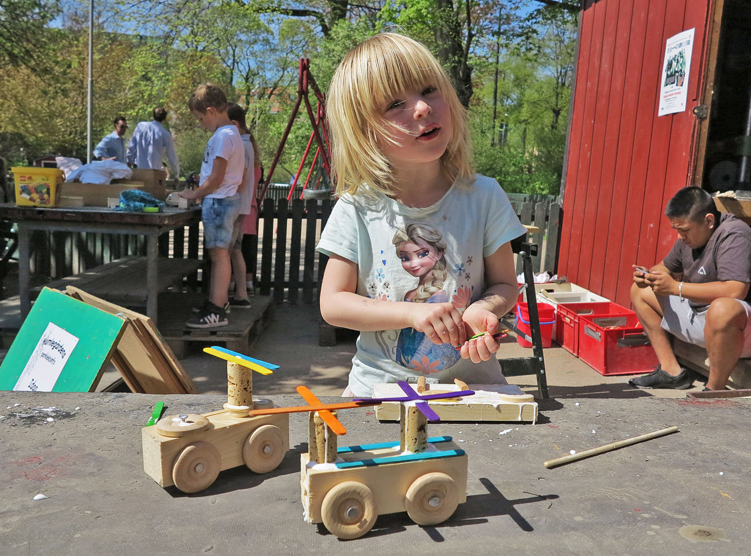 Sista parken för helgen var Humlegården dit jag, Jonna och Junior tog bussen igår. Där är det alltid massor av folk, mammor i högklackat, turister med specialkameror och välordnade aktiviteter. Det säljs fika och korv att grilla, finns toalett (viktig detalj) och igår fick barnen snickra. Junior och Jonna gjorde varsin helikopter.