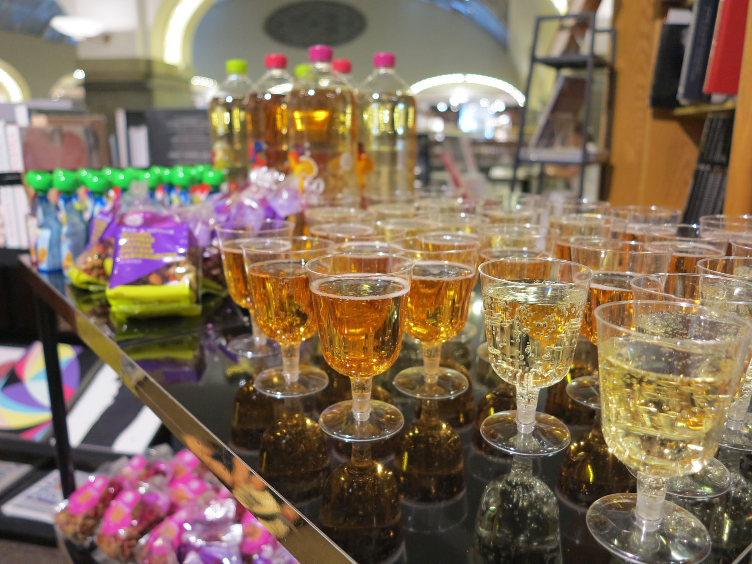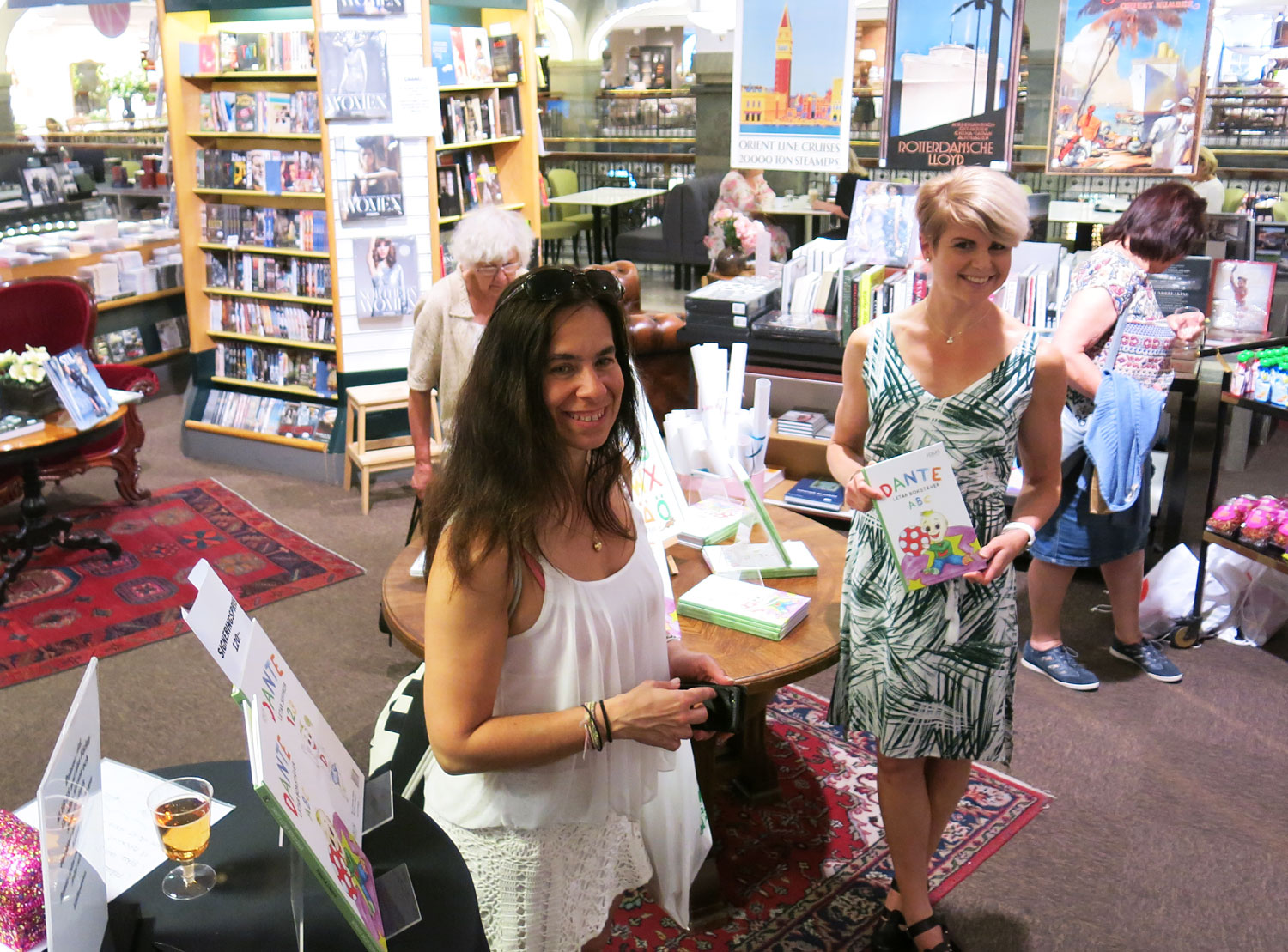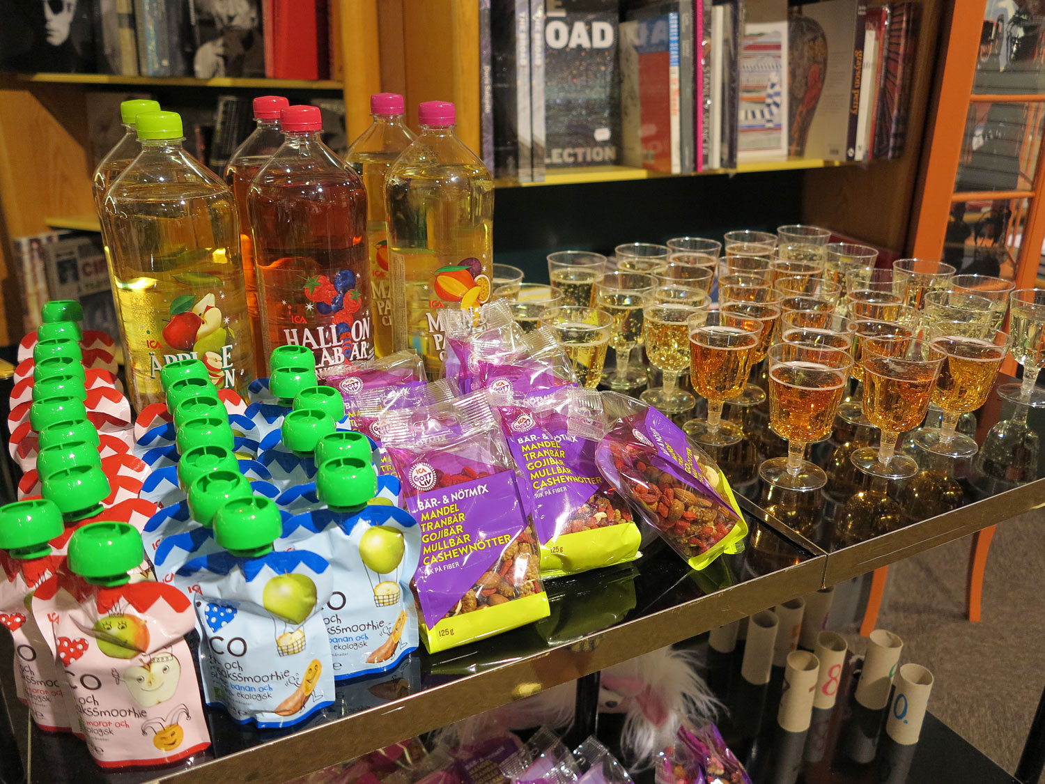 Jag och Caroline förklarar bokens budskap och utformning för alla som kikar förbi, att den passar barn i olika ålder och inlärningsfas, och att du kan läsa den från olika håll. Det kramas, dricks bubbeldryck och signeras böcker.
